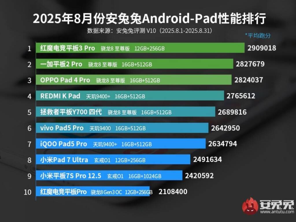 Возглавил рейтинг игровой планшет Red Magic Gaming Tablet 3 Pro (он также Red Magic Astra Gaming Tablet) на базе процессора Qualcomm Snapdragon 8 Elite. Его средняя оценка в AnTuTu составляет более 2,9 миллиона баллов.