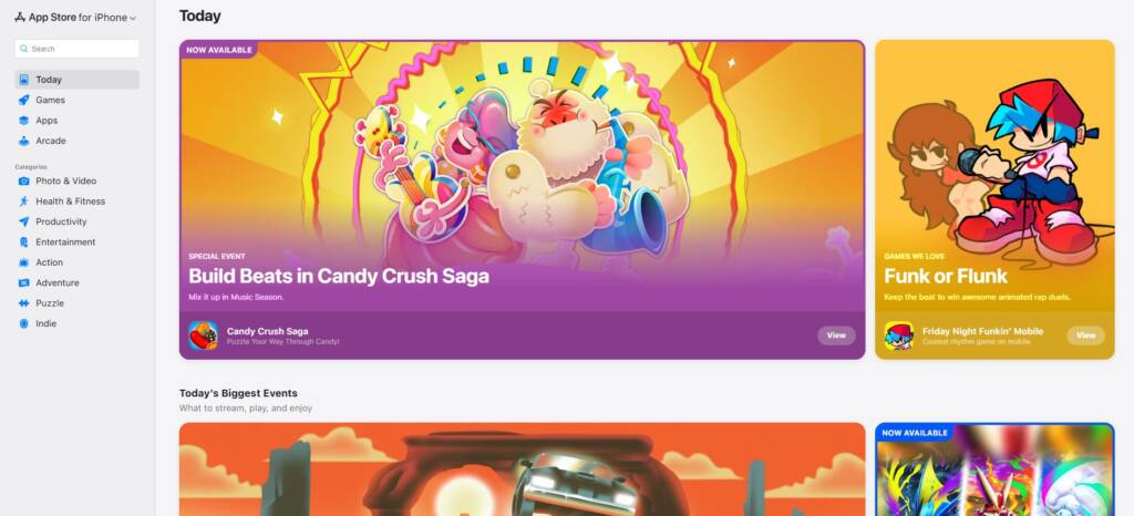 На сайте появилась вкладка Today с подборками и рекомендациями, а также разделы с играми, приложениями и тайтлами Apple Arcade. Каждое приложение имеет собственную страницу с описанием, скриншотами и кнопкой для открытия в App Store, если оно установлено на устройстве.