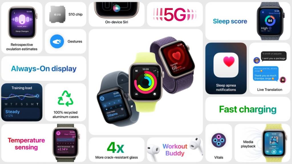 Новейшая версия оснащена чипом S10, обеспечивающим более быструю работу. В SE 3 впервые появился дисплей, который всегда включен, а также поддержка жестов, таких как двойное касание и движения запястий. Часы поддерживают быструю зарядку-всего 15 минут на заряд обеспечивают до 8 часов работы.