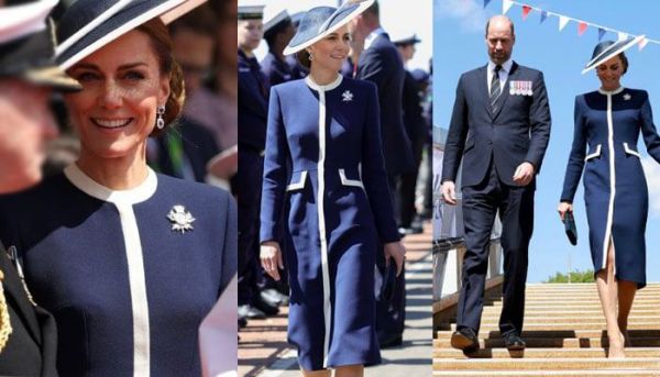The Princess of Wales chose a dark blue coat-dress with white stripes by British brand Suzannah London and an elegant hat by famous designer Philip Treacy. The look was a reference to Princess Diana’s outfit, which Lady Di wore at the Battle of the Atlantic anniversary ceremony in 1993 – a Catherine Walker coat-dress with a similar cut and colour scheme.