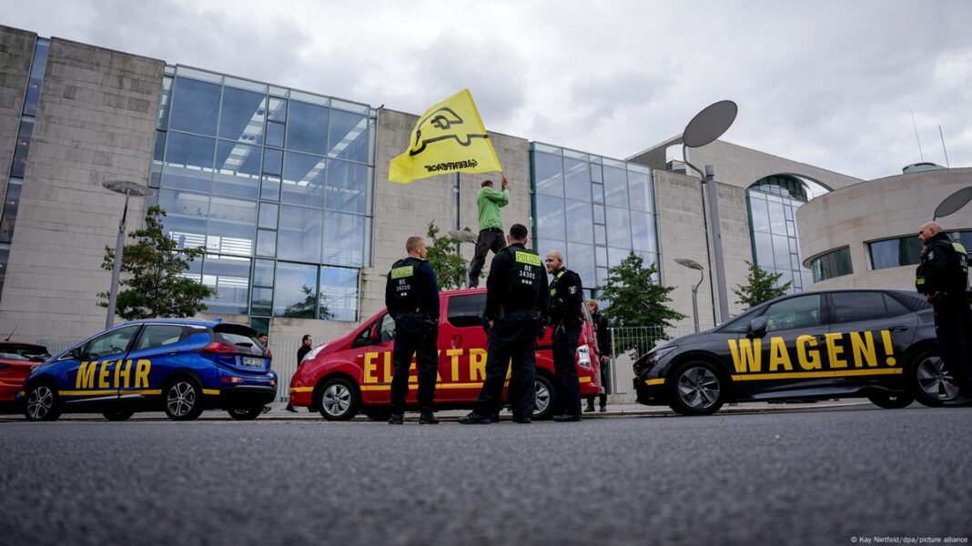 Активисты «Гринпис» и «Пятницы для будущего» ждали возле канцелярии в Берлине в четверг, протестуя, когда ведущие политики и руководители автопроизводителей собрались на переговоры.