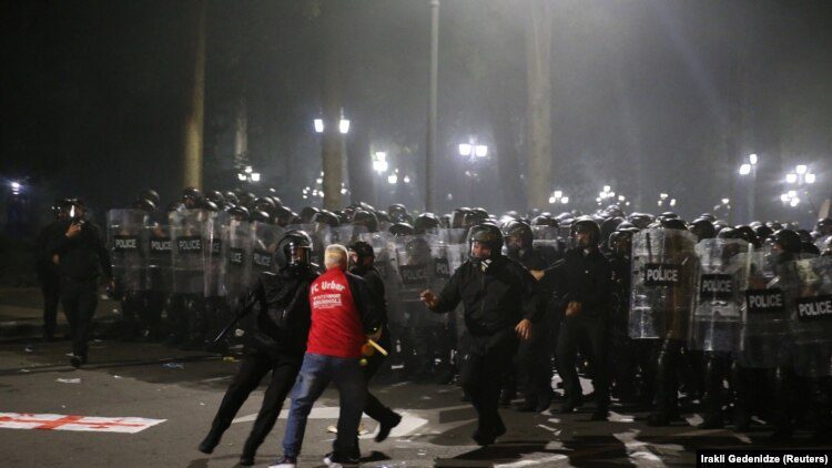 Видео, опубликованные Грузинской службой Радио Свобода, показали, что как полицейские, так и протестующие вступали в физические столкновения, а демонстранты бросали неустановленные предметы.
