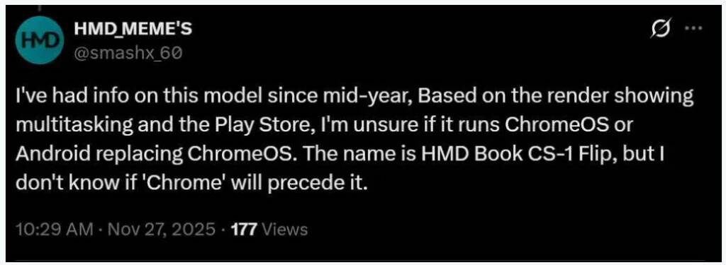 HMD, которая ранее ориентировалась в основном на производство смартфонов, планирует выйти на рынок персональных компьютеров. Об этом сообщил инсайдер под ником smashx_60 в социальной сети X (ранее Twitter), раскрыв некоторые предварительные подробности о новом устройстве. По словам инсайдера, дебютная модель может называться HMD Chromebook CS-1 Flip или HMD Book CS-1 Flip. Судя по обозначению Flip, речь идет о ноутбуке-трансформере с вращающимся на 360 градусов экраном, который позволяет использовать устройство как в классическом, так и в планшетном режиме. Инсайдер отмечает, что видел ранние рендеры ноутбука, на экране которых отображался магазин приложений Google Play, что могло указывать на использование ChromeOS или другой платформы с поддержкой экосистемы Google. На данный момент технические характеристики и дата выхода модели официально не разглашаются. По данным источника, первые упоминания об устройстве начали появляться в отраслевых кругах в середине этого года.