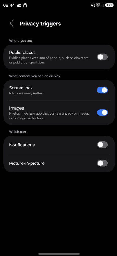 Предусмотрен специальный переключатель Auto Privacy, который автоматически активирует функцию в людных местах, в частности в метро или лифте. Также можно будет задавать расписание ее работы или применять ограничения для отдельных программ. Privacy Display сможет скрывать сообщения, окна «картинка в картинке» и личные изображения из галереи.