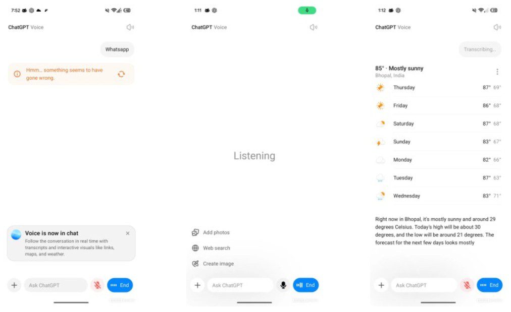 OpenAI работает над улучшением голосового режима ChatGPT – теперь он может стать частью обычного окна чата, а не отдельного полноэкранного интерфейса. Это позволит пользователям видеть различный контент во время разговора: погоду, карты, ссылки и другие визуальные элементы, которые ранее были недоступны в голосовом режиме.