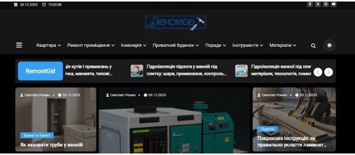 RemontGid — блог про ремонт своїми руками, який зручний саме структурою та «прикладним» підходом: від кімнат і видів робіт — до інженерії, інструментів і матеріалів.