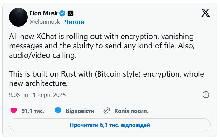 “мы запускаем совершенно новый XChat со сквозным шифрованием, исчезающими сообщениями и возможностью передачи любых типов файлов. Доступны также аудио-и видеозвонки», — сообщил Маск в соцсети X.