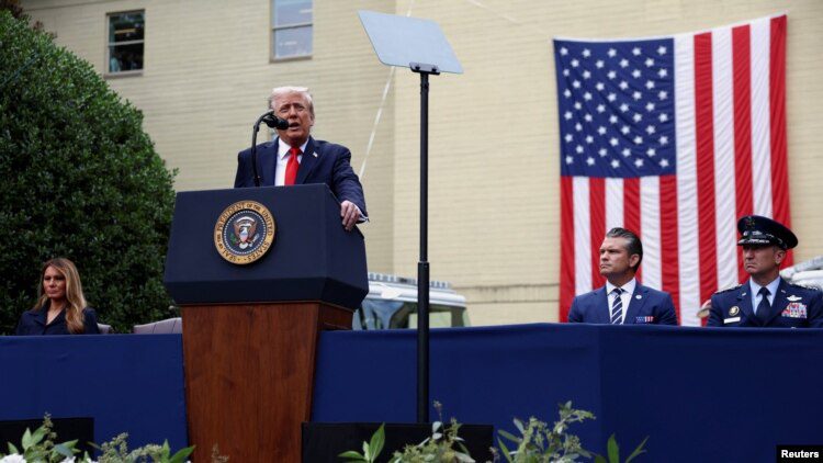 Президент США Дональд Трамп и его жена Мелания приняли участие в мемориальной церемонии в Пентагоне, посвященной 24-й годовщине терактов 11 сентября 2001 года.