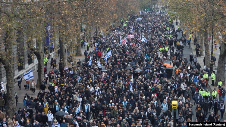 Сообщается, что вышедшие на марш в воскресенье лондонцы несли плакаты с надписями «Бок о бок с британскими евреями» и «Нулевая терпимость к антисемитам». Также на плакатах были изображены заложники-израильтяне, удерживаемые боевиками «Хамаса», признанного США и ЕС террористической группировкой. Агентство Reuters отмечает, что полиция Лондона за один только октябрь получила сообщение о 554 преступлениях на почве антисемитизма. В тот же период прошлого года таких преступлений было чуть больше сорока.