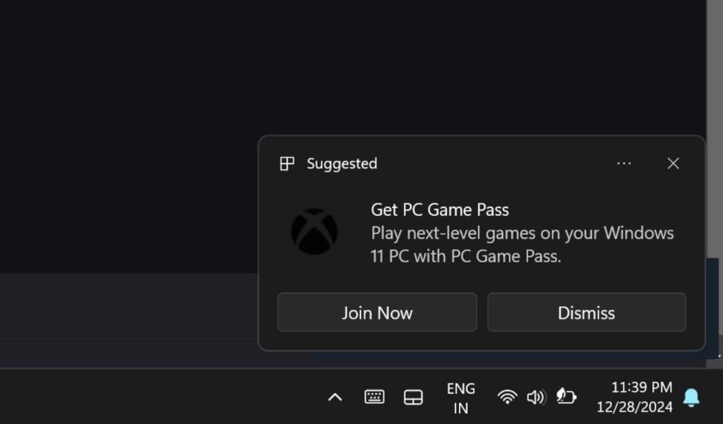Сообщается, что ранее пользователи Windows 11 могли видеть всплывающие сообщения, посвященные продукту Windows Defender и игре Black Ops 6, а теперь Microsoft аналогичным образом хочет привлечь внимание к платформе Xbox Game Pass для ПК, известной также как PC Game Pass – для этого клиентам компании демонстрируют предлагающую рекламную вставку. попробовать этот продукт.